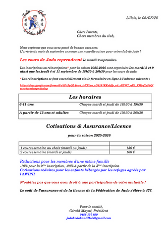 Les Info's pour la nouvelle saison